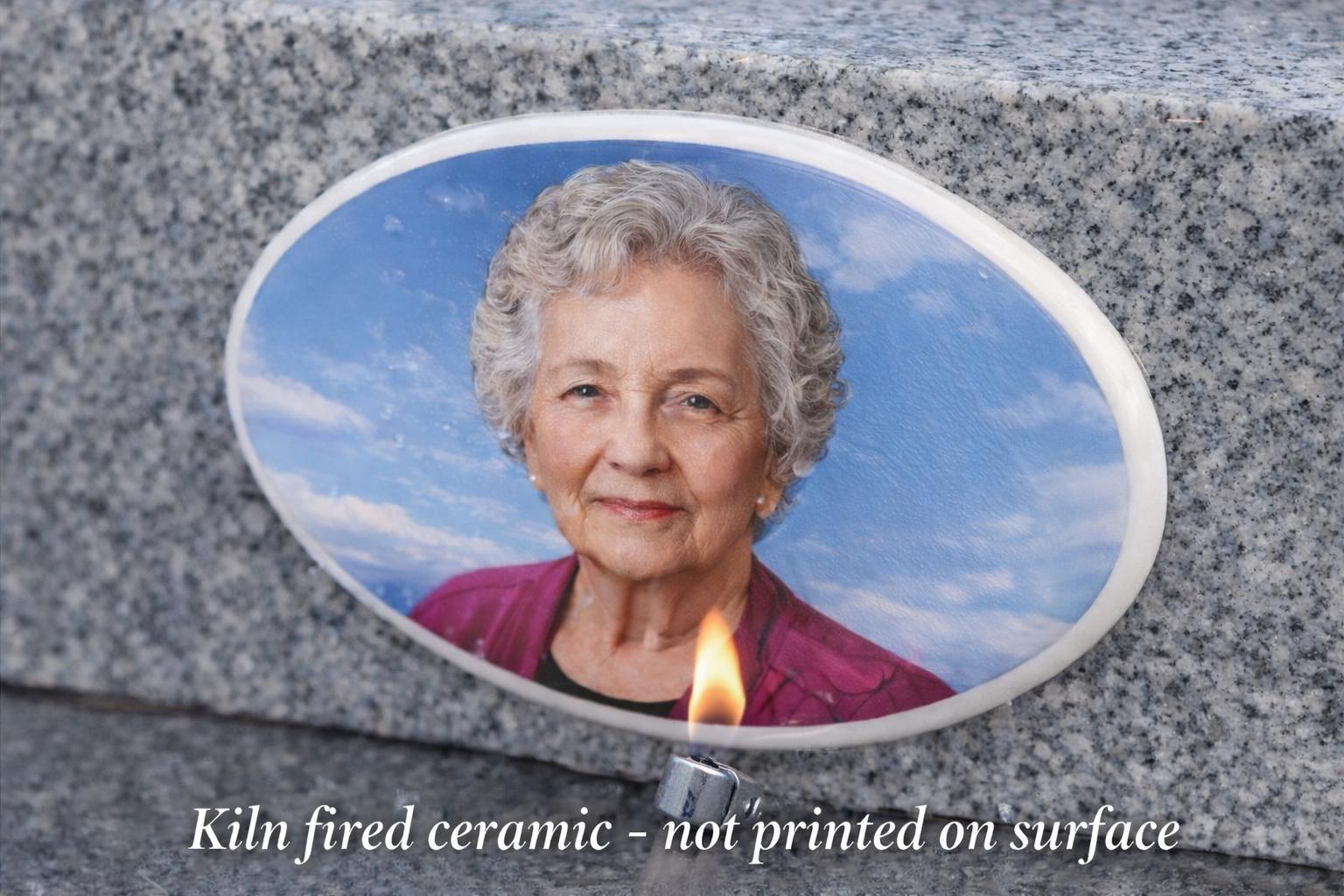 The photo is printed on high-quality porcelain using professional ceramic techniques developed for memorial applications.