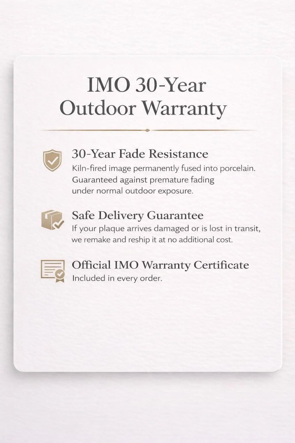 A: The warranty covers premature fading of the image under normal outdoor cemetery exposure. Each plaque includes an official IMO Warranty Certificate. Please keep it together with your proof of purchase for validation. The warranty applies to image fade resistance and does not cover physical damage or breakage.