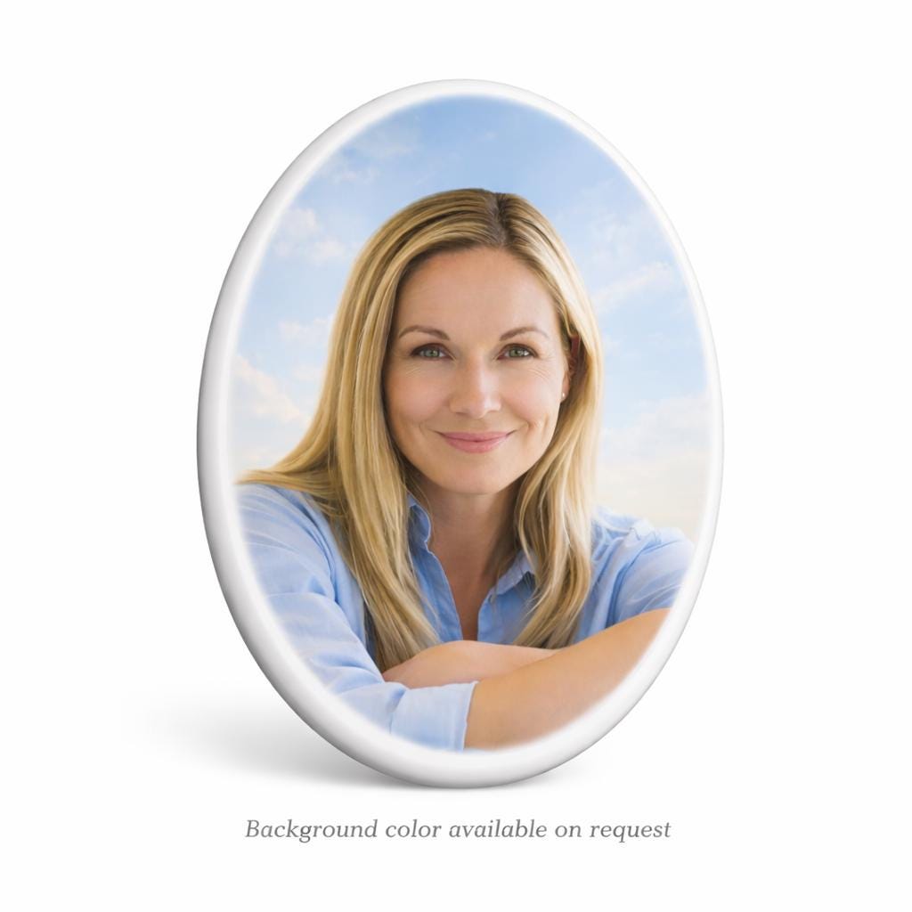 This oval porcelain photo plaque is created to preserve a photograph on a gravestone or memorial surface, maintaining clarity and durability over time.