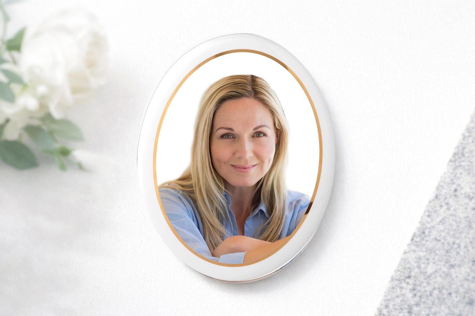 Oval porcelain photo plaque with real gold trim for gravestones and memorials.