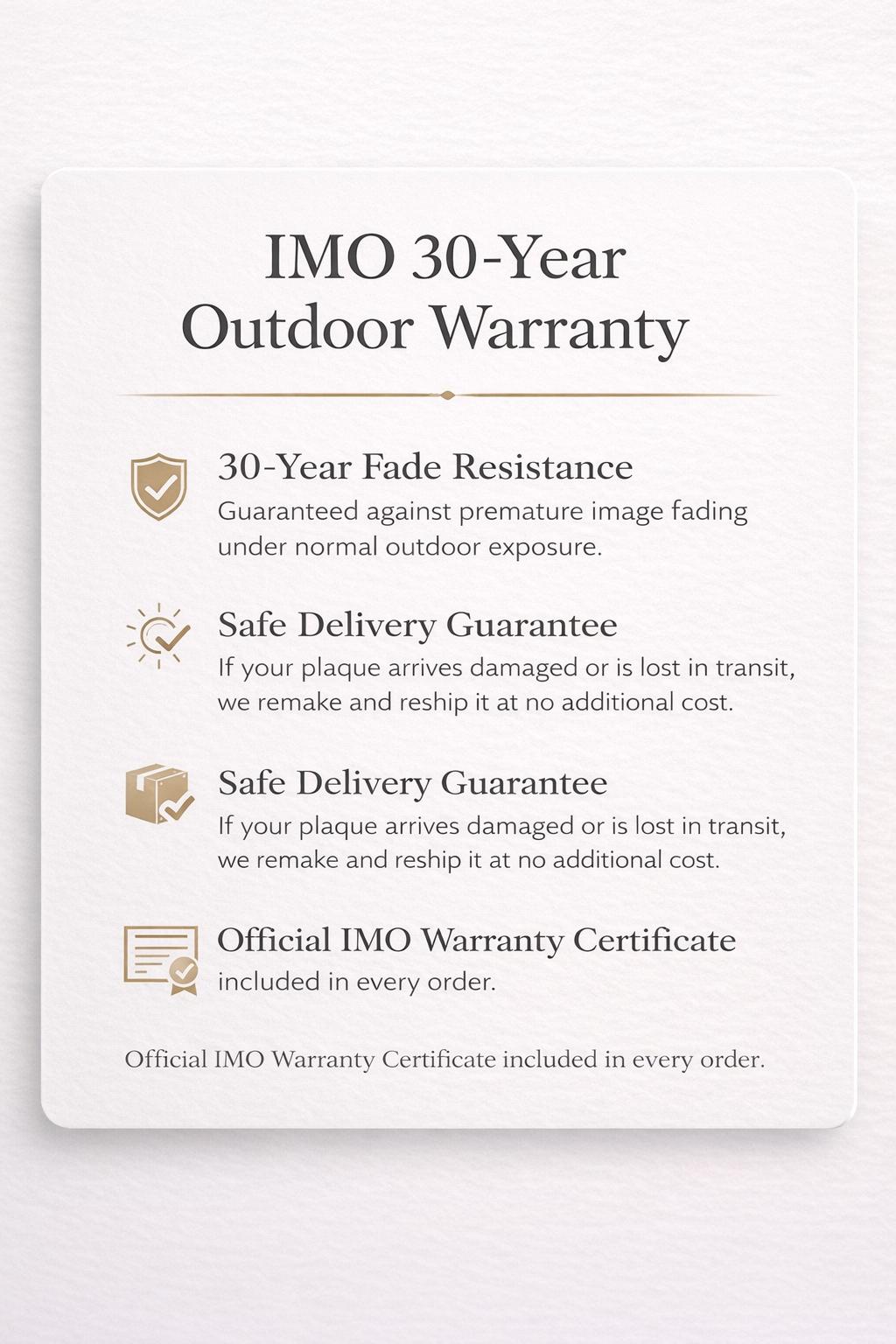 A: The warranty covers premature fading of the image under normal outdoor cemetery exposure. Each plaque includes an official IMO Warranty Certificate. Please keep it together with your proof of purchase for validation. The warranty applies to image fade resistance and does not cover physical damage or breakage.