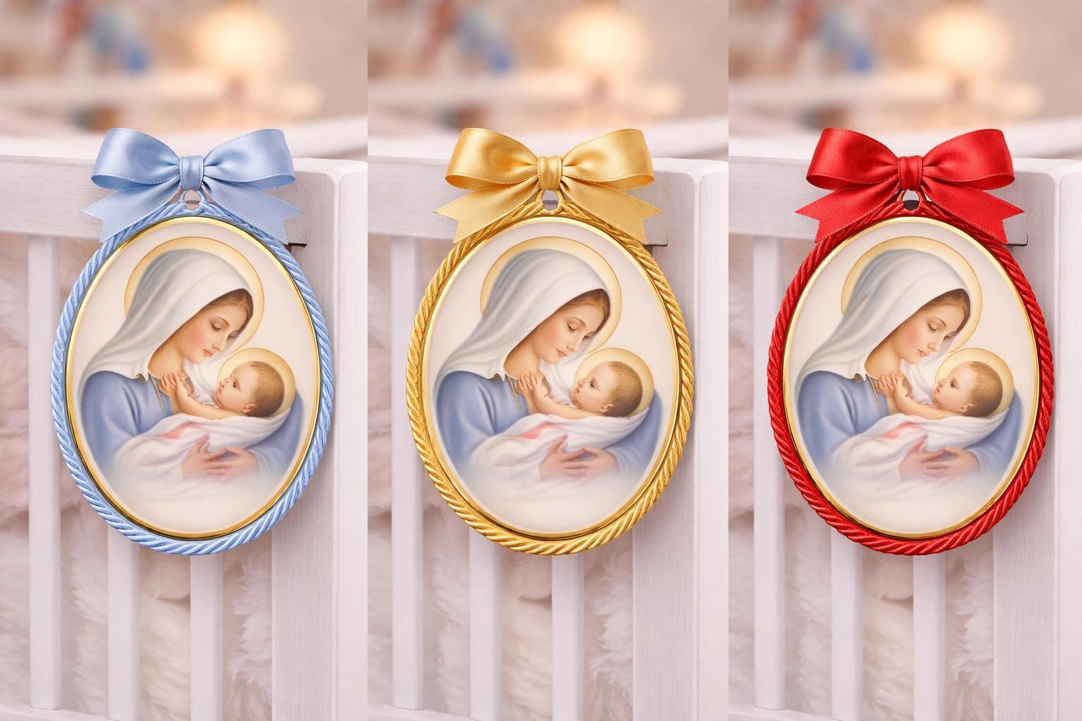 This **Blessed Madonna & Baby Jesus ceramic medallion** is designed to be delicately hung on a baby crib as a sign of blessing and spiritual protection. Each piece is **entirely handmade in Italy**, following a careful artisanal process that honors tradition, quality, and attention to detail.