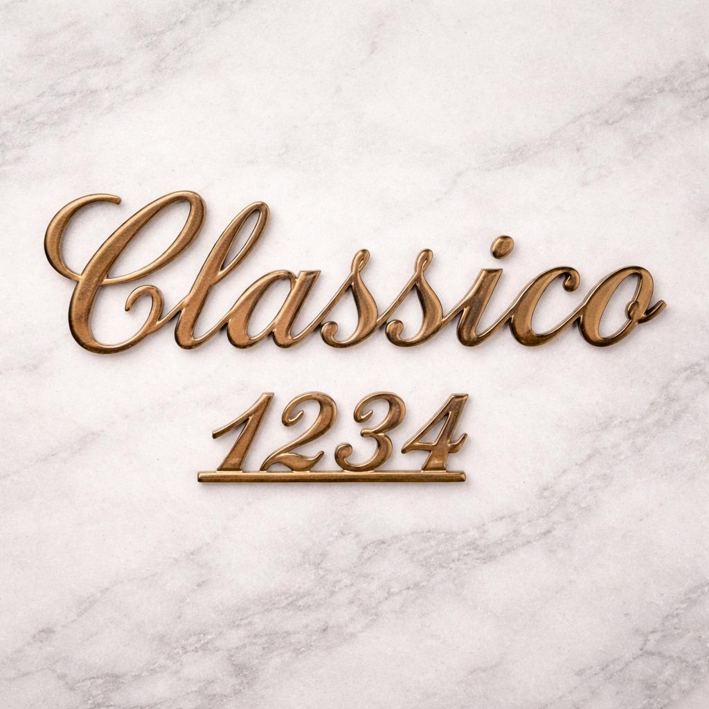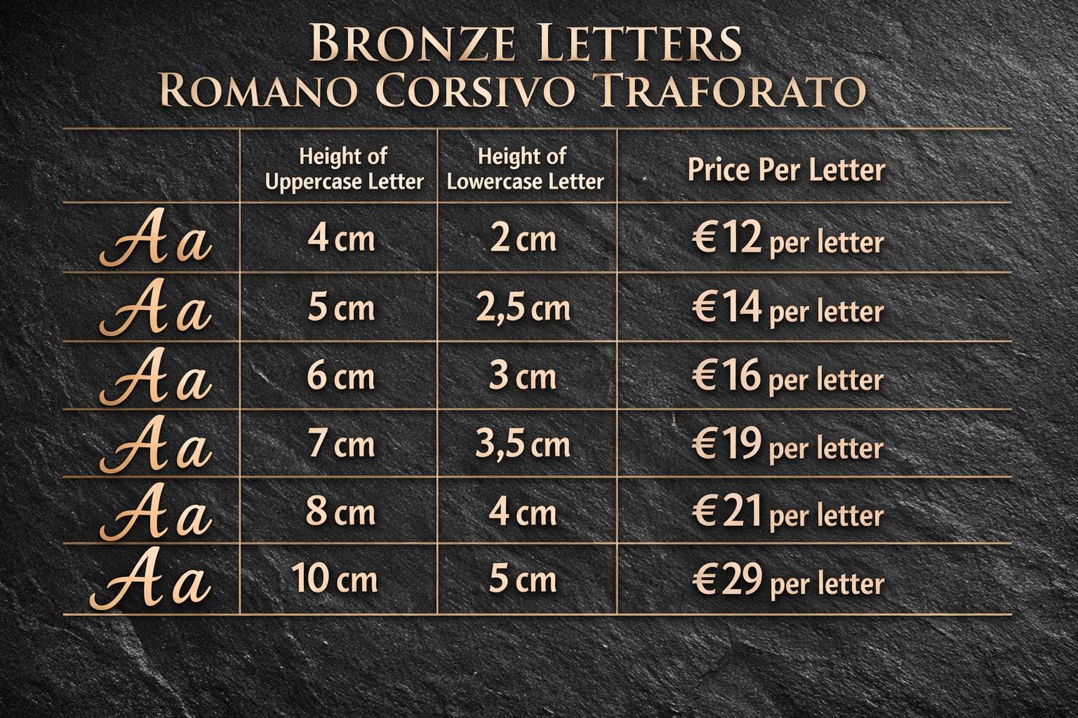 The Roman Italics perforated font features connected characters, creating a refined, continuous inscription ideal for names, surnames, and commemorative dates.
