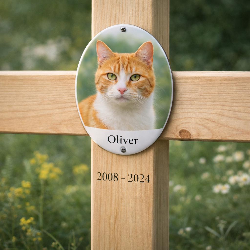 Oval ceramic pet memorial photo for dog or cat, designed for outdoor grave markers and remembrance.