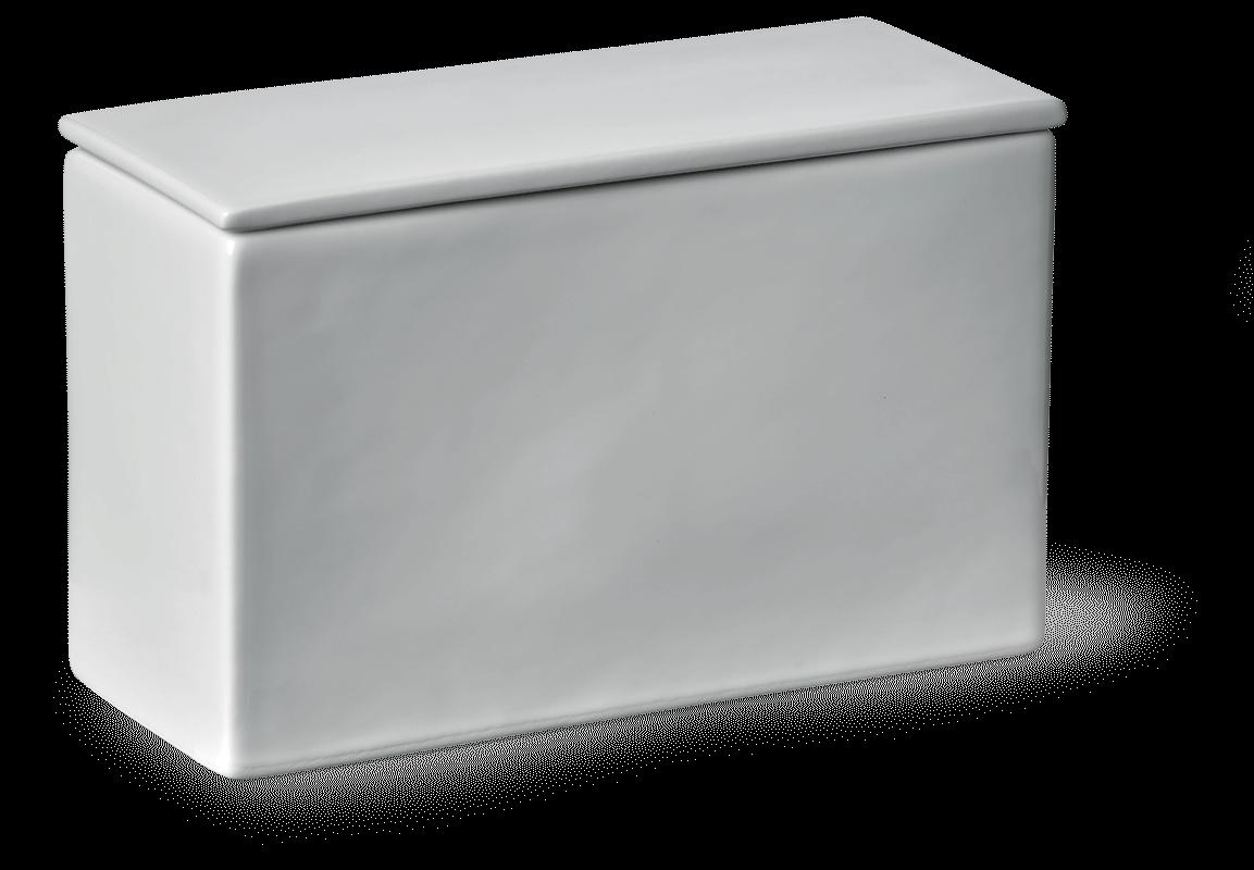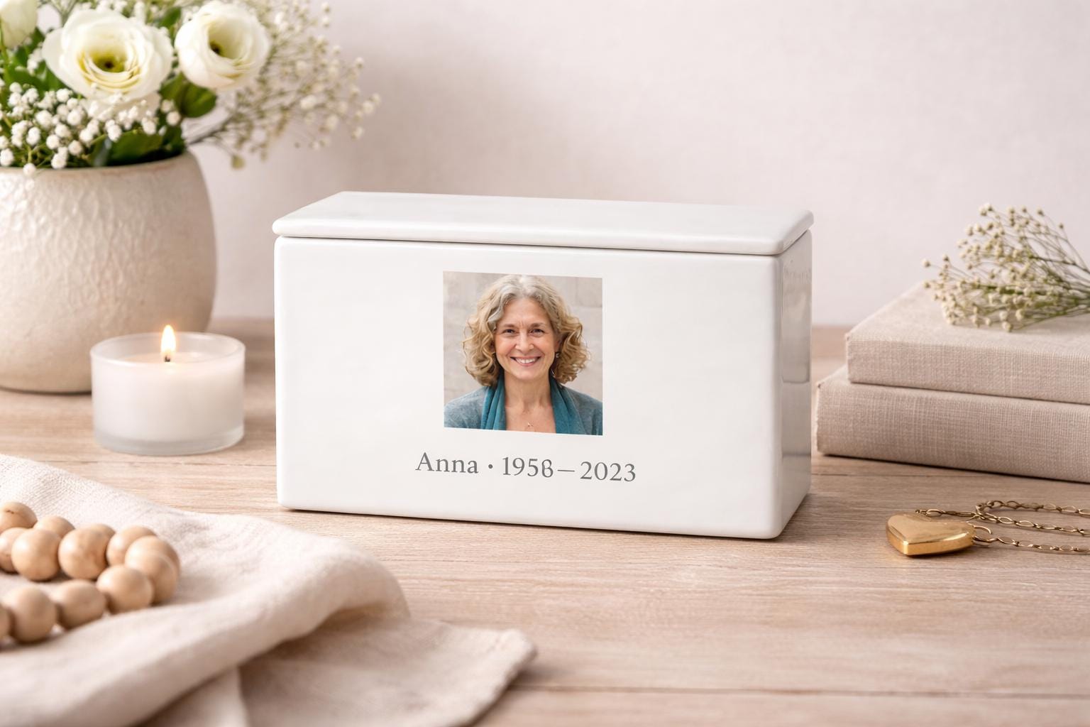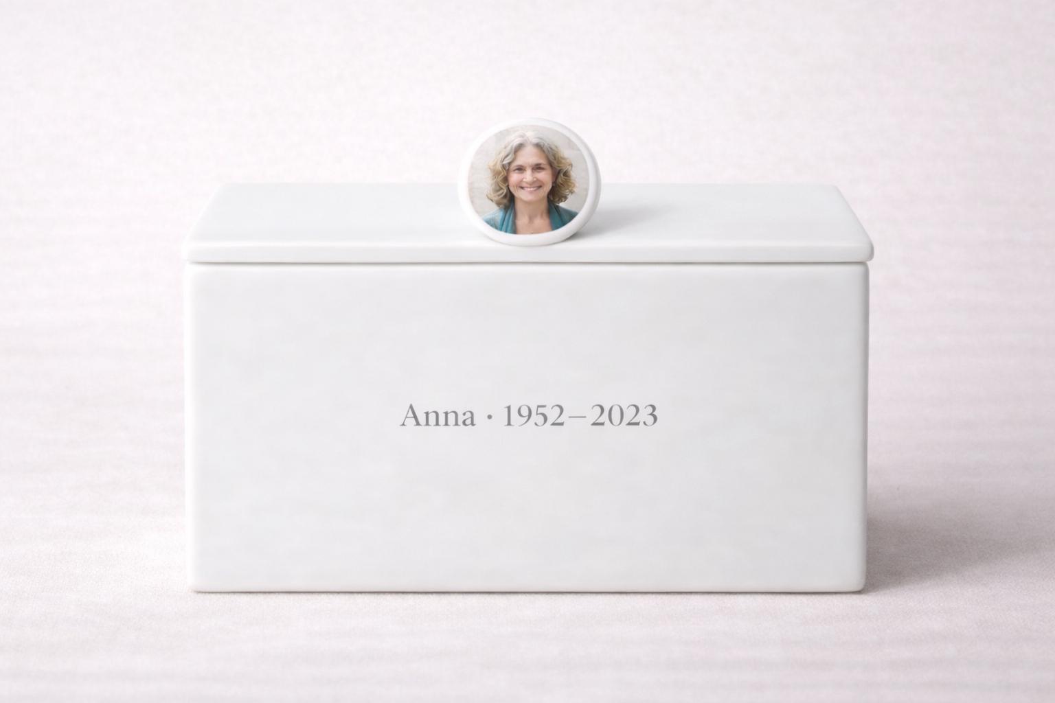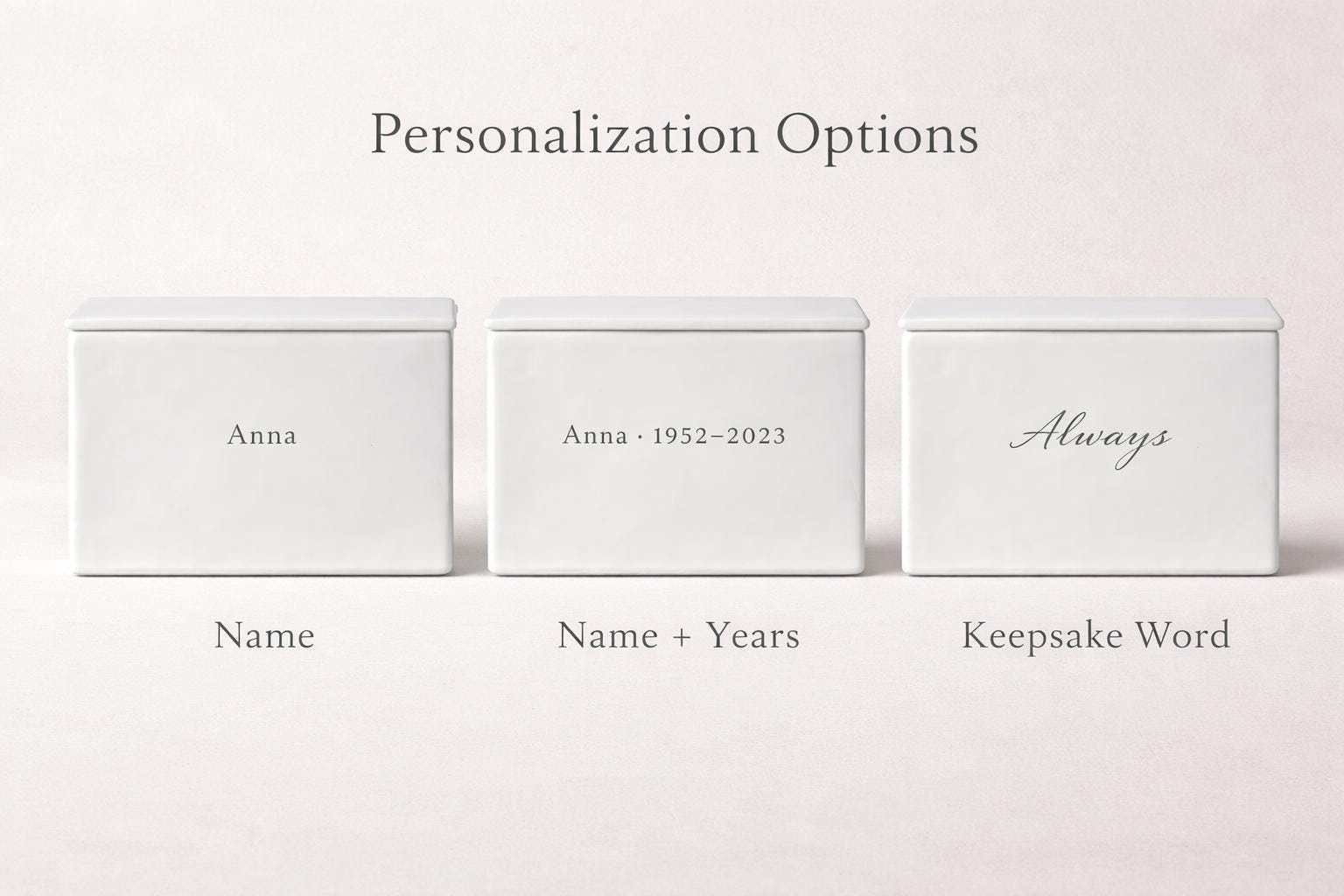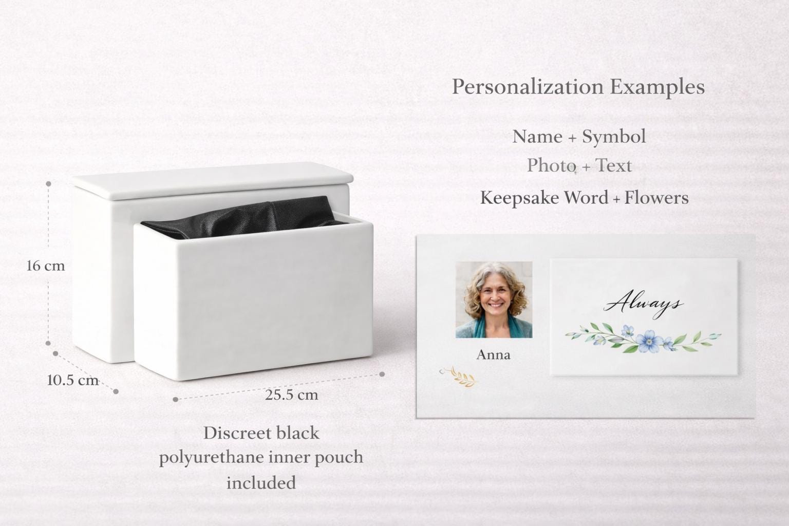 Made in glazed porcelain, the urn features a clean architectural shape and can be personalized with permanent ceramic decal, fired in the kiln for durability and permanence.