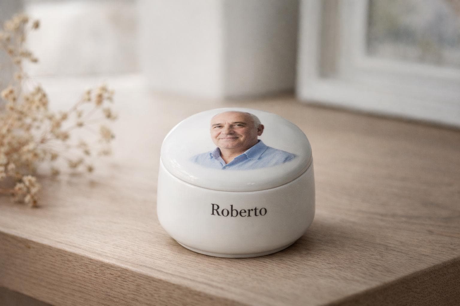 The printed photo brings the face closer, while the small scale keeps the object light, discreet, and respectful.