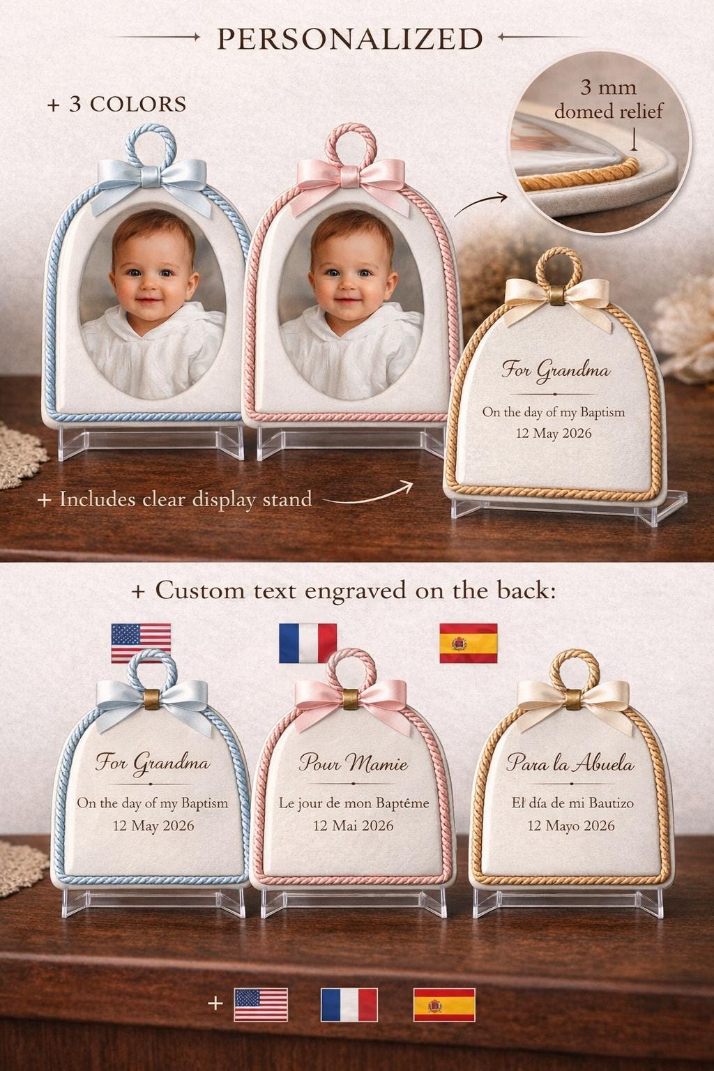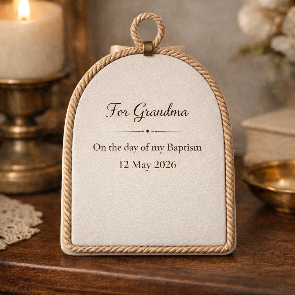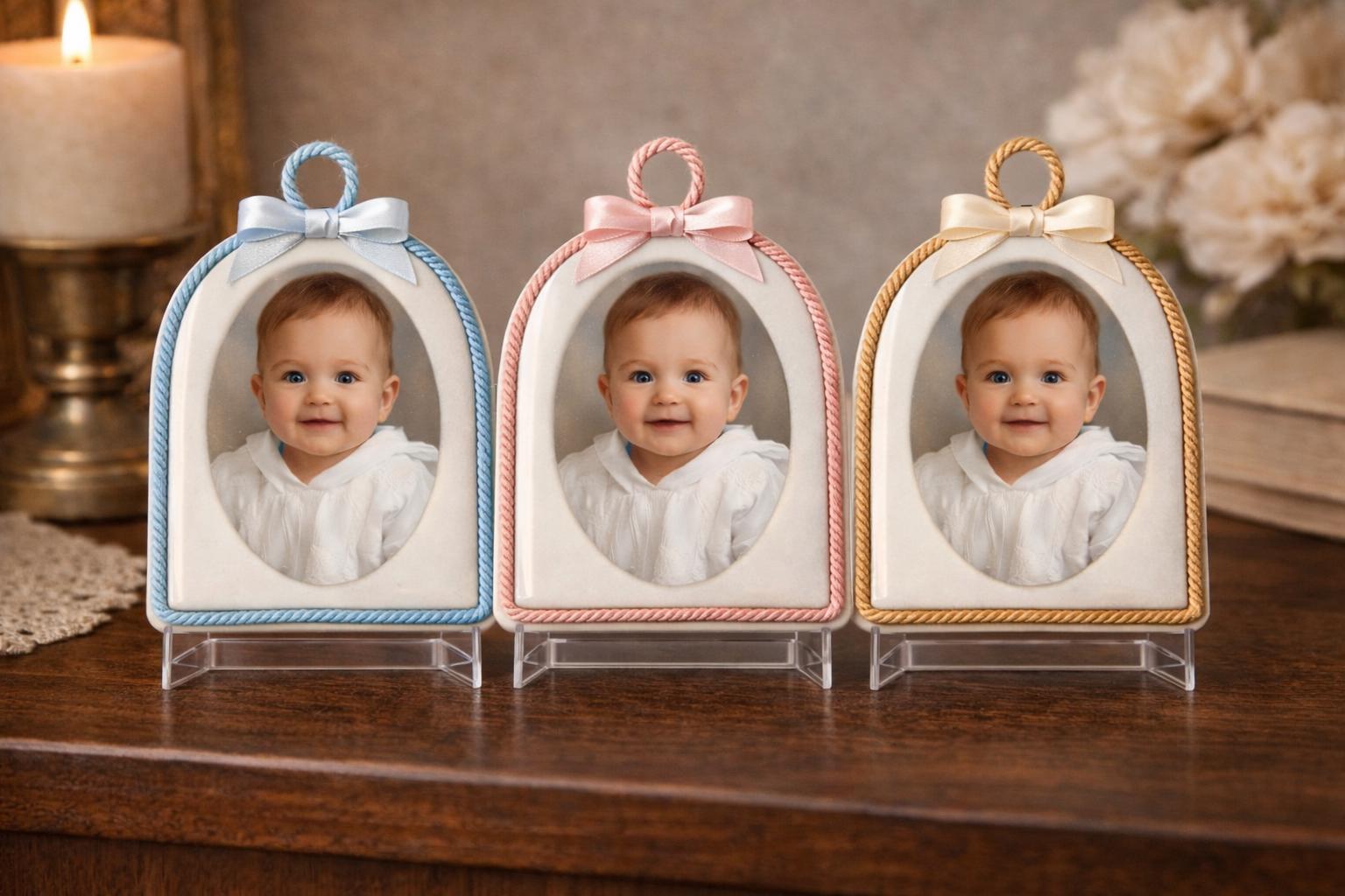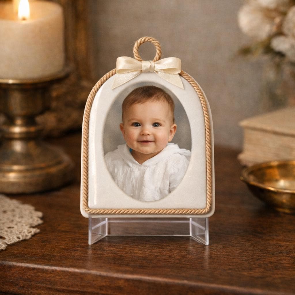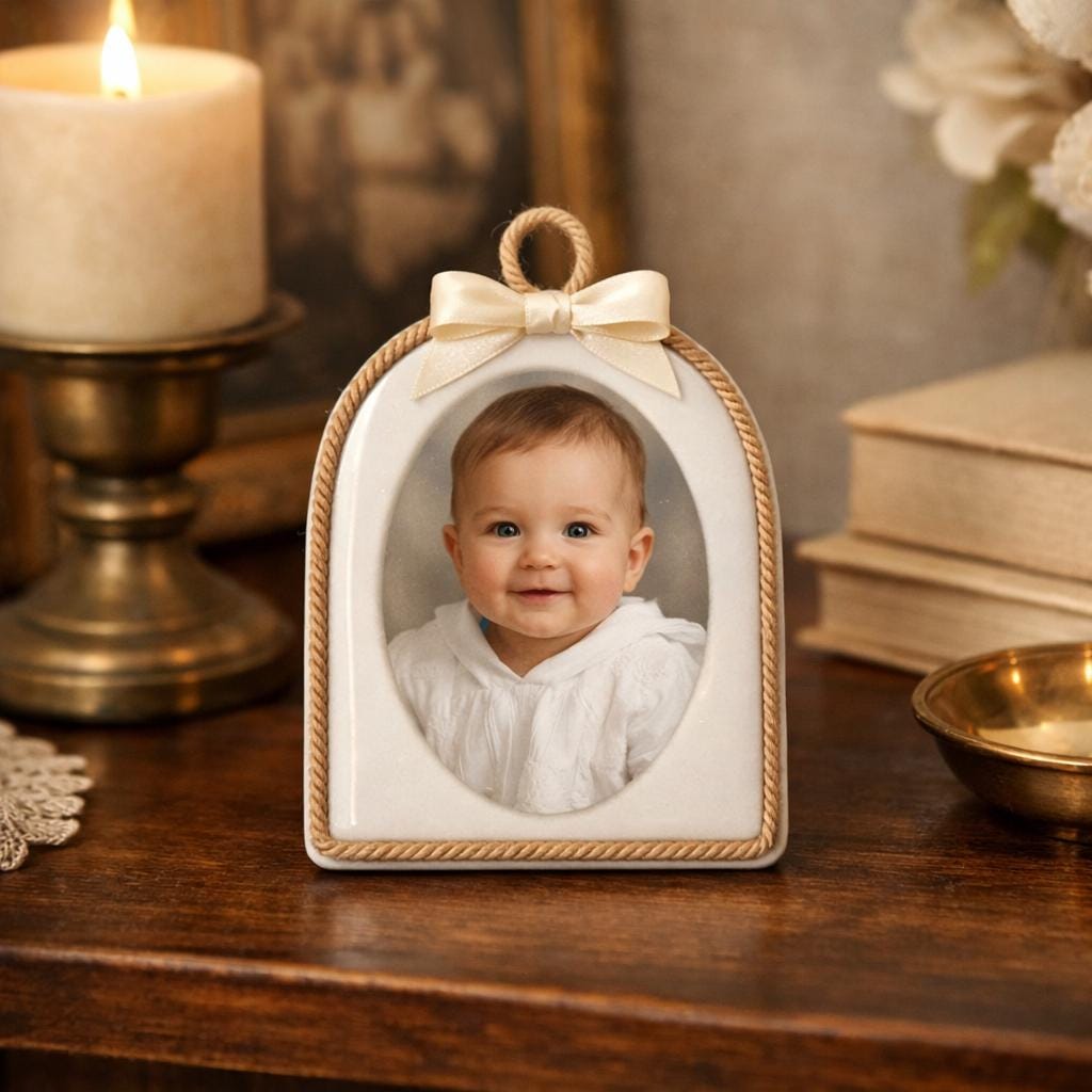 This handcrafted dome plaque transforms your baby’s photo into a meaningful votive-style keepsake — a small object of love to display at home, treasure in a nursery, or keep as a reminder of a special moment such as a baptism, naming ceremony, or birth celebration.