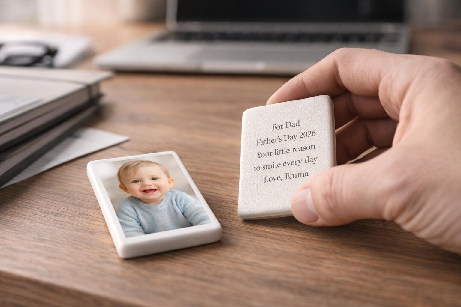 This personalized pocket photo for Dad is a small, solid keepsake designed to stay quietly on his desk — like something he can turn in his hands whenever he needs it.