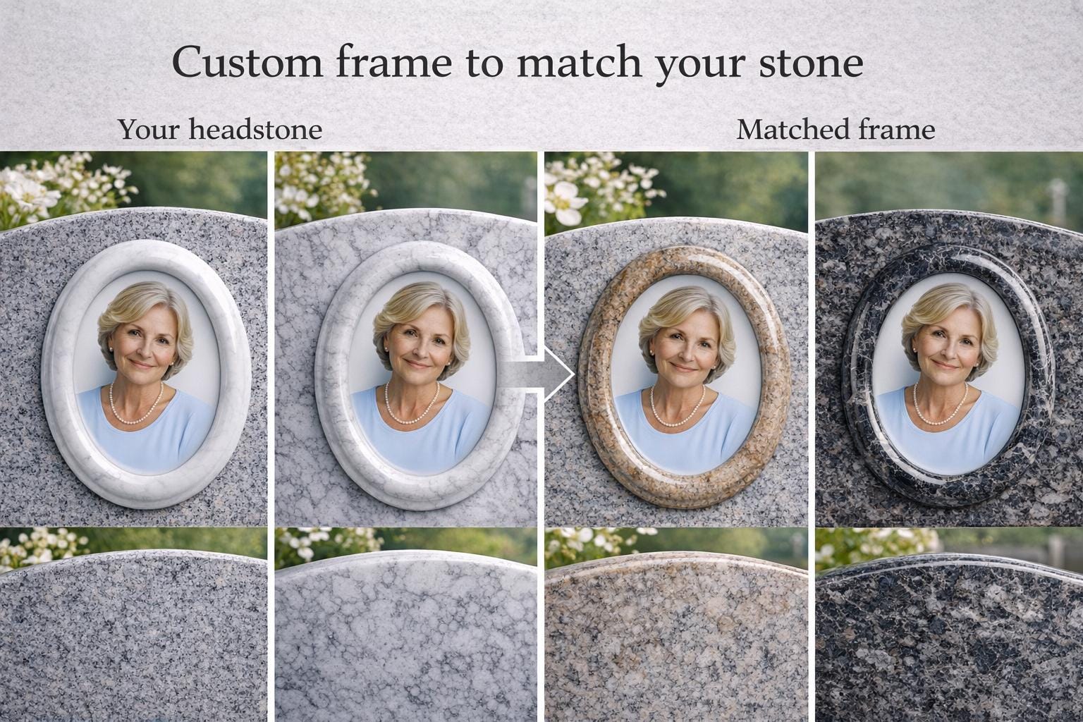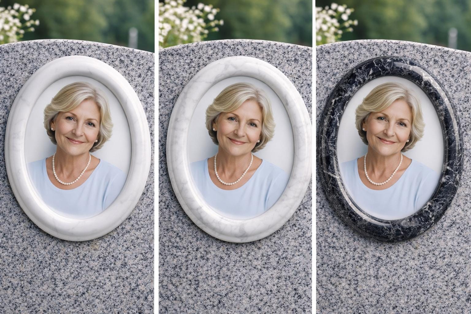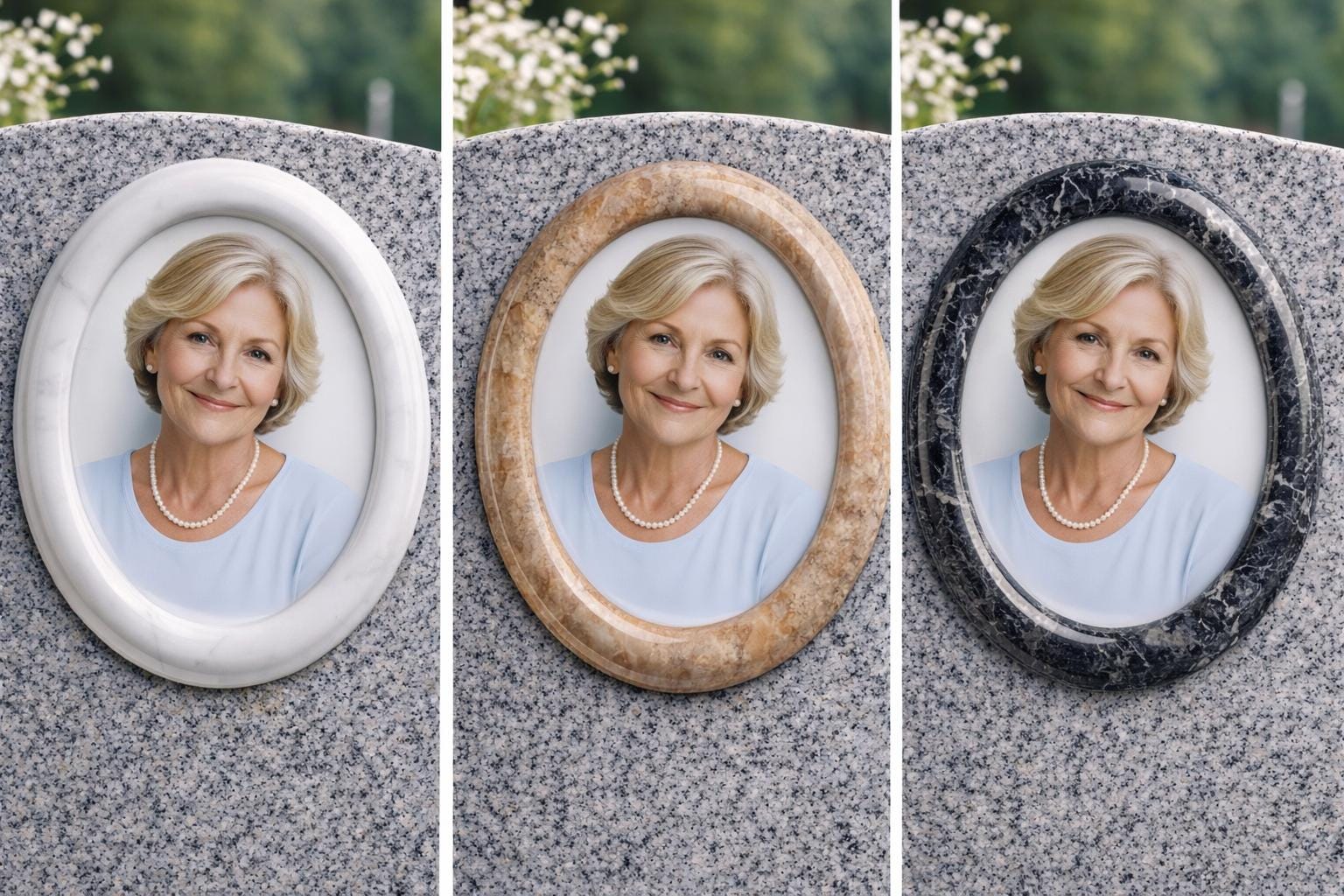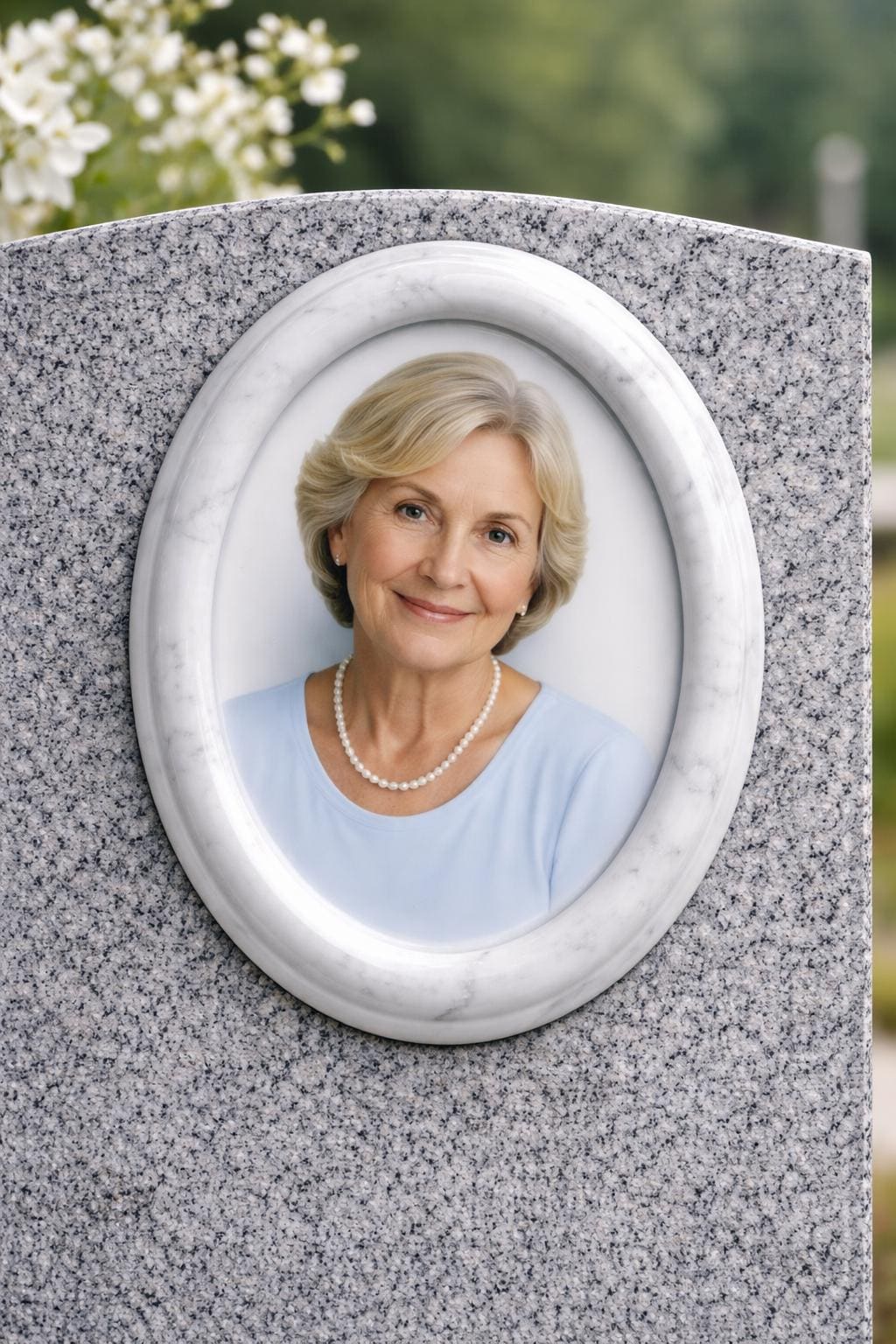 **Oval Ceramic Memorial Photo with Marble Frame – Custom Headstone Portrait**